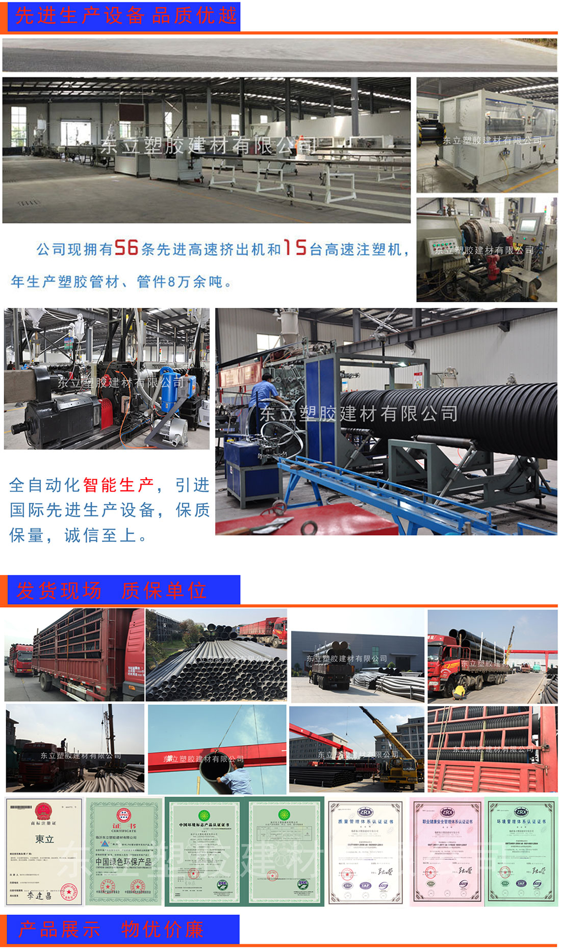 ??主要生產(chǎn)“東立”品牌塑膠管道,主要產(chǎn)品包括五大系列十六種產(chǎn)品,規(guī)格齊全,產(chǎn)能龐大、供貨及時,設(shè)備先進(jìn)、質(zhì)量穩(wěn)定,服務(wù)優(yōu)良、滿足客戶的需求。